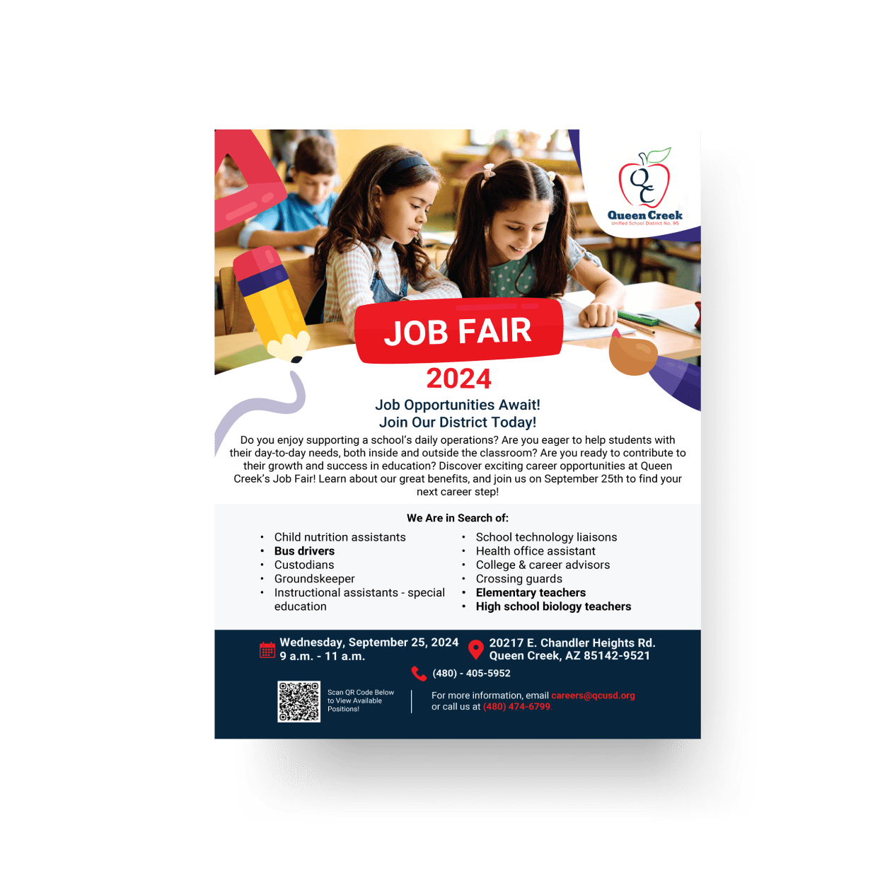 A bright and inviting flyer announcing Queen Creek’s 2024 Job Fair. It lists the roles being hired for and encourages local community members to join the district’s team, with clear event details and contact info.